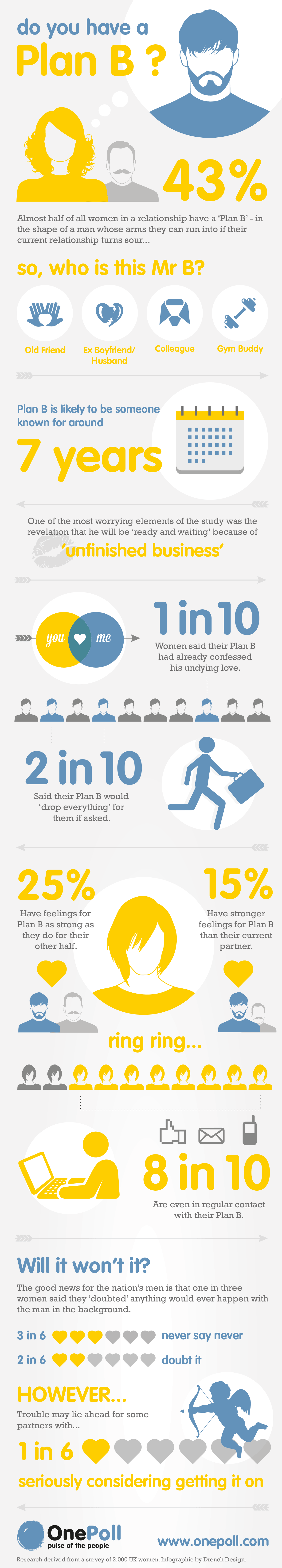 25% of the people surveyed said that they have feelings as strong for their Plan B as they do their other half, whereas a shocking 15% said that they have stronger feelings for the back-up man than they do for their current partner.