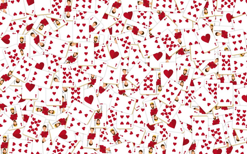This image features packs upon packs of playing cards, each bearing the famous red suit – but there’s only one card that shows the Queen of Hearts.