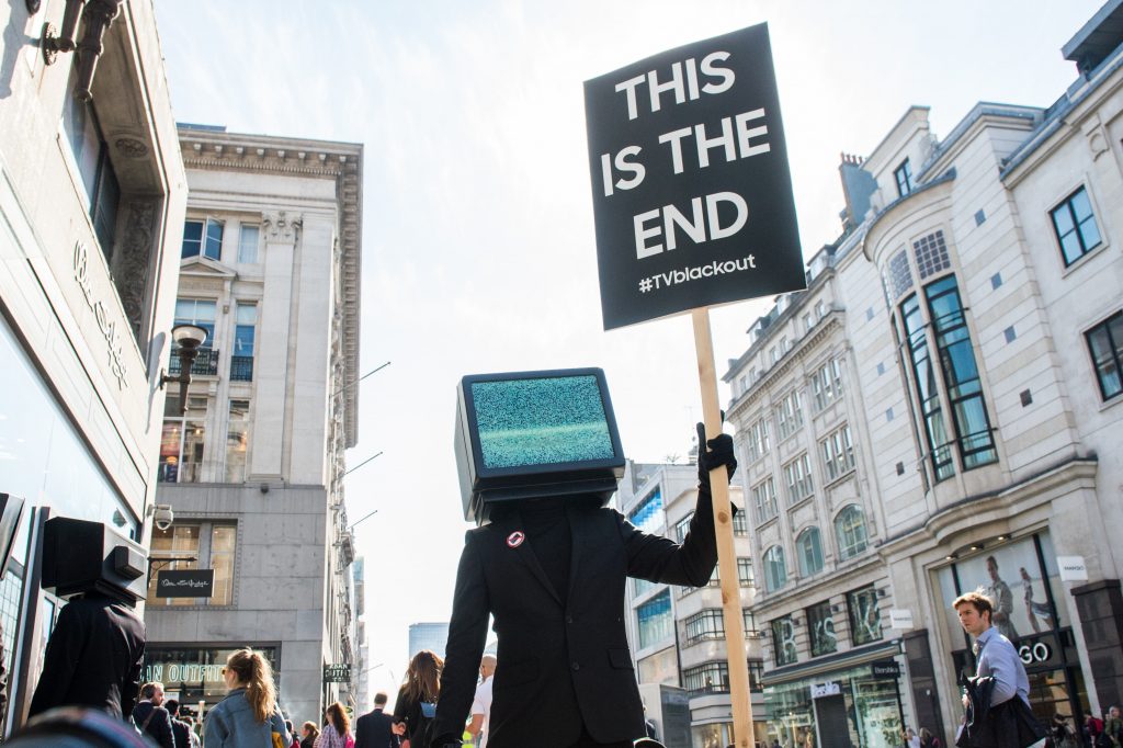 A bizarre trio of TV-headed people will also be roaming around the capital telling consumers that ‘This is the end’ for their old televisions, using the hashtag #TVblackout.