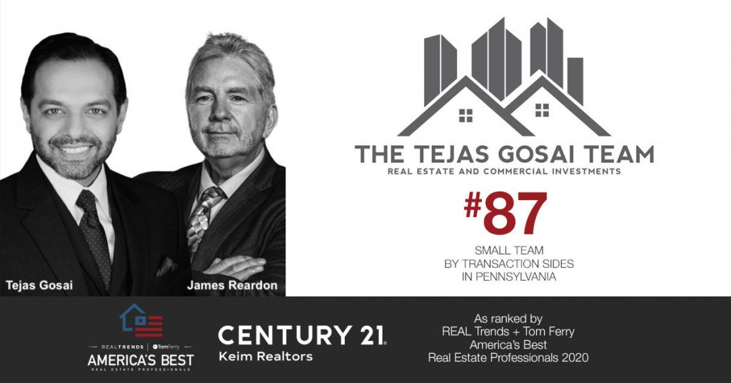 Bethlehem, Pennsylvania, July 1, 2020 – The Tejas Gosai Team was named one of America’s most productive real estate teams as a part of REAL Trends + Tom Ferry America’s Best Real Estate Professionals, a ranking report produced by REAL Trends and Tom Ferry International. Since its start in 2018, The Tejas Gosai Team has built an ironclad reputation as trusted advisors with a knack for navigating the undercurrents of the Lehigh Valley’s booming marketplace. Today, Tejas Gosai is based in Bethlehem, Pennsylvania, under the banner of Century 21 Keim Realtors. The Tejas Gosai Team finished 2019 by ranking in the top 100 Century 21 teams in the United States and in the top 3 Century 21 teams in the state. Gosai’s team is now a national member of the “America’s Best Real Estate Teams,” and ranked number 87th for the Commonwealth of Pennsylvania.