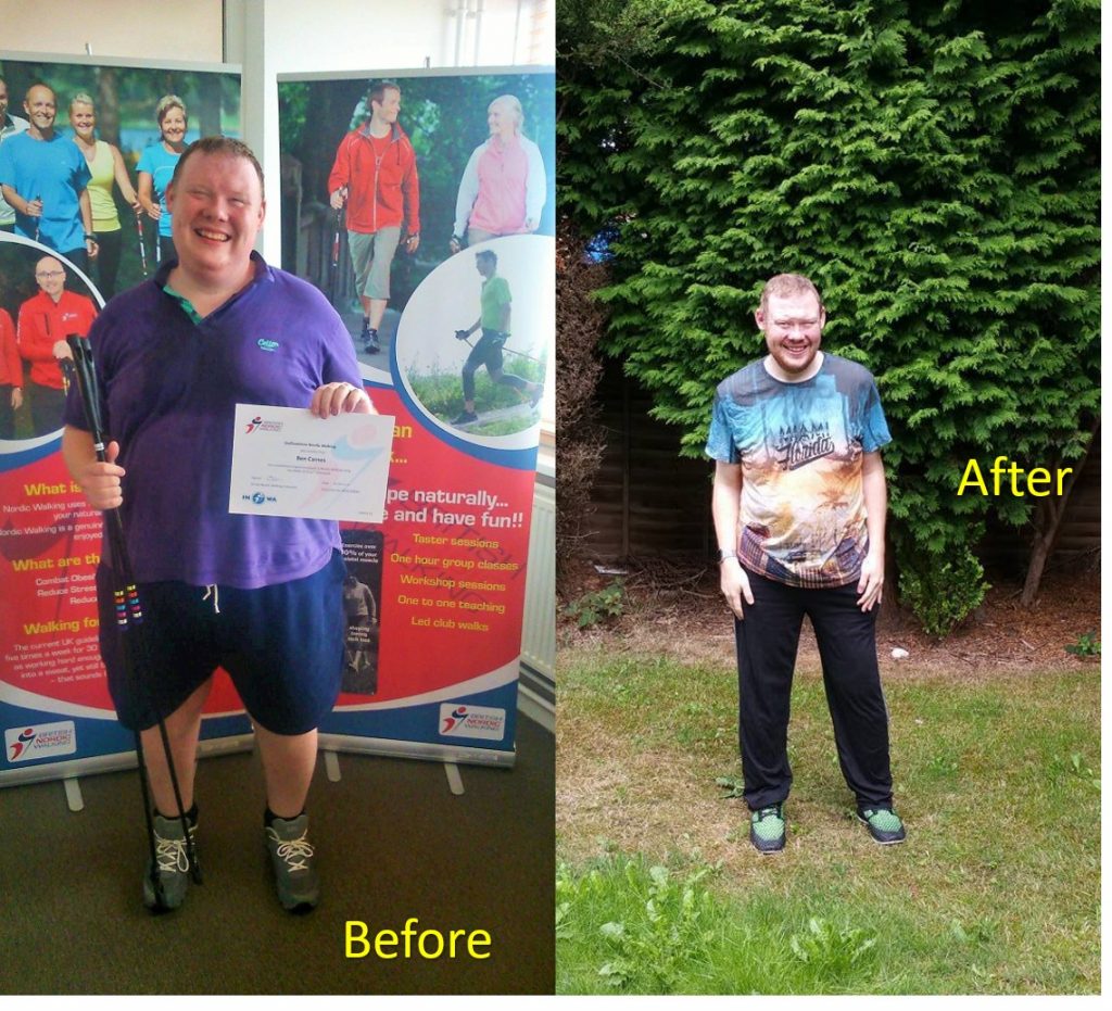 Gareth Davies is a British Nordic Walking instructor and Master Personal Trainer based in Stafford who has led a team to the 2019 Nordic Walking World Cup. He said, “I am certain that Nordic Walking has a valuable part to play in achieving significant weight loss and have seen this many times with my own clients. One, Ben Carnes, was pre-diabetic when we met and struggled with his general mobility. After working with me for 18 months he had lost over thirteen stone, normalised his blood glucose levels and completed several British Nordic Walking Challenges.”