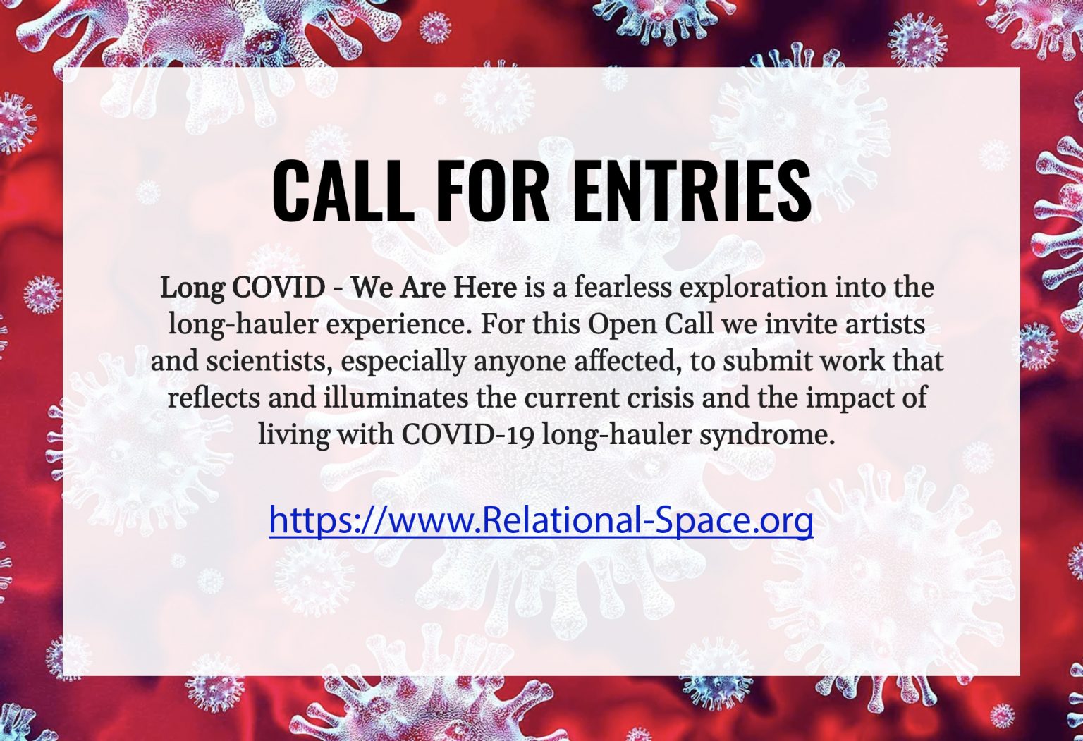 Brooklyn, December, 2020 – Contemporary art and immersive installation community leader Relational Space announces today a new arts and science collaborative exhibit, Long-COVID – We Are Here. Designed as a fearless exploration into the COVID-19 Long-Hauler experience, the spring 2021 virtual event will feature the collaborative work of diverse artists, scientist and others impacted by the lingering and debilitating effects of the novel coronavirus.