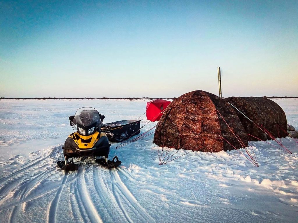 - A tent with an insulated base to prevent it from soaking and a breathable covering to allow unrestricted airflow. Ventilation will prevent drops of water appear on the surface and the snowfall inside the tent in the morning.