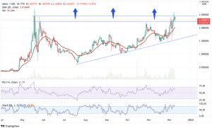 On December 7, MATIC’s price sliced above the prevailing chart pattern’s topside trend line, confirming the bullish outlook.