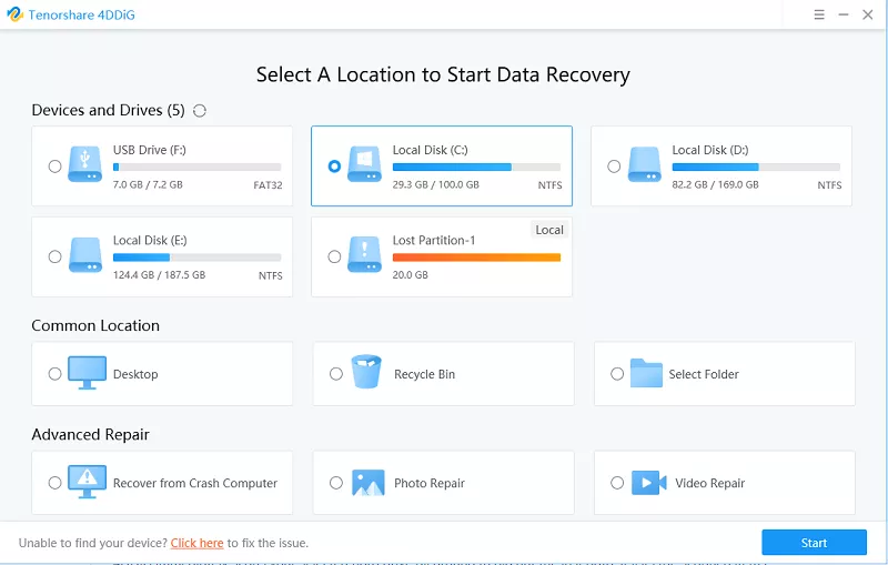 Step 2. In this step, select the local disk from where you have lost the photos. Hit Start to get started.
