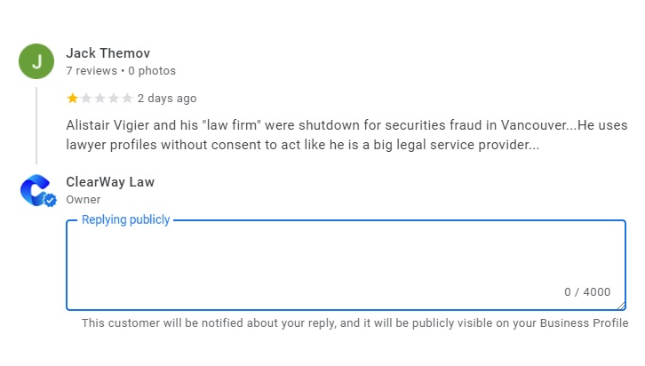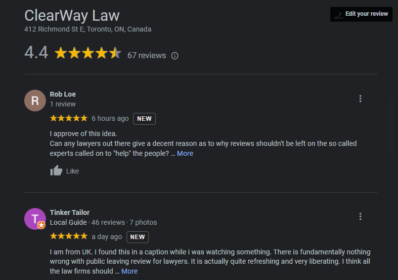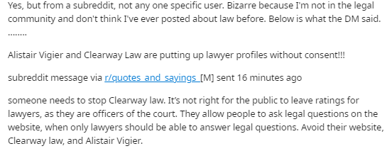 This Reddit posting came from the marketing manager of a law firm in Toronto. He contacted me and demanded I took down the profiles of all the lawyers at his firm. He said only he could control the online reputation of his lawyers. He also posted that I was a molester on Google Maps, which was later removed by Google.