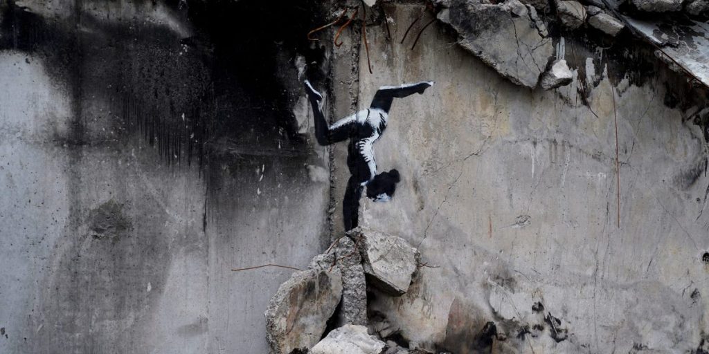 - Banksy created a mural showing a gymnast balance on a pile in Borodyanka Ukraine.