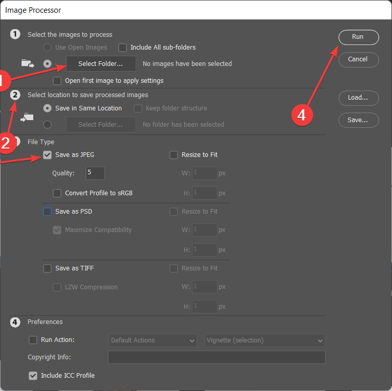 - Next, choose Select Folder to locate and select your SRW files. Then choose the folder you want your converted files to be saved. After that, select the file types you want your SRW files to be converted to before hitting the Run button.