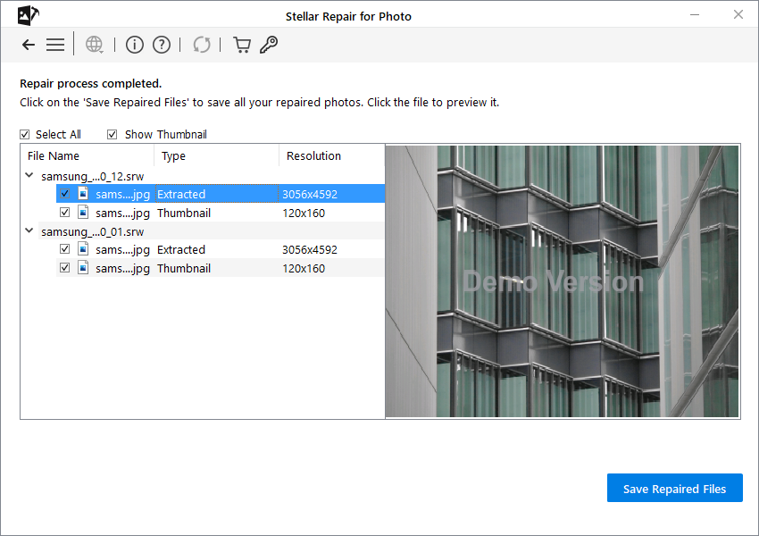 - Preview the repaired files and click Save Repaired Filesto restore the photos at a desired location on your PC or external drive.