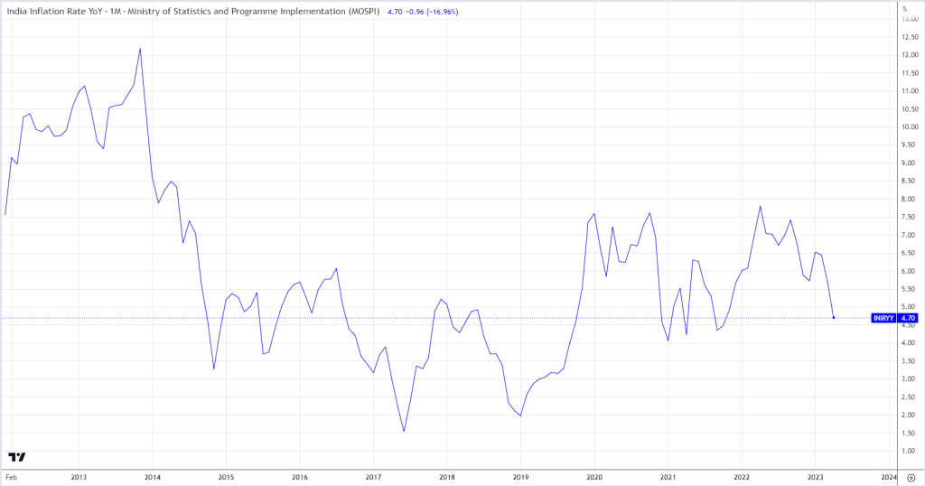 Inflation in India has been on a declining trend according to the latest economic calendar data. In April 2023, it dropped to 4.7% compared to 5.66% in March and 6.44% in February.