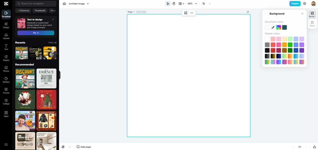 - After finalizing the size, an option exists to upload the image or create one from scratch. To upload, access the left-side vertical column and click on the upload tab. This will help you select the file from your device or upload one directly from the cloud or Dropbox. Later start the editing for that specific image in your style. You have an option exist to tweak color, text, brightness, etc.